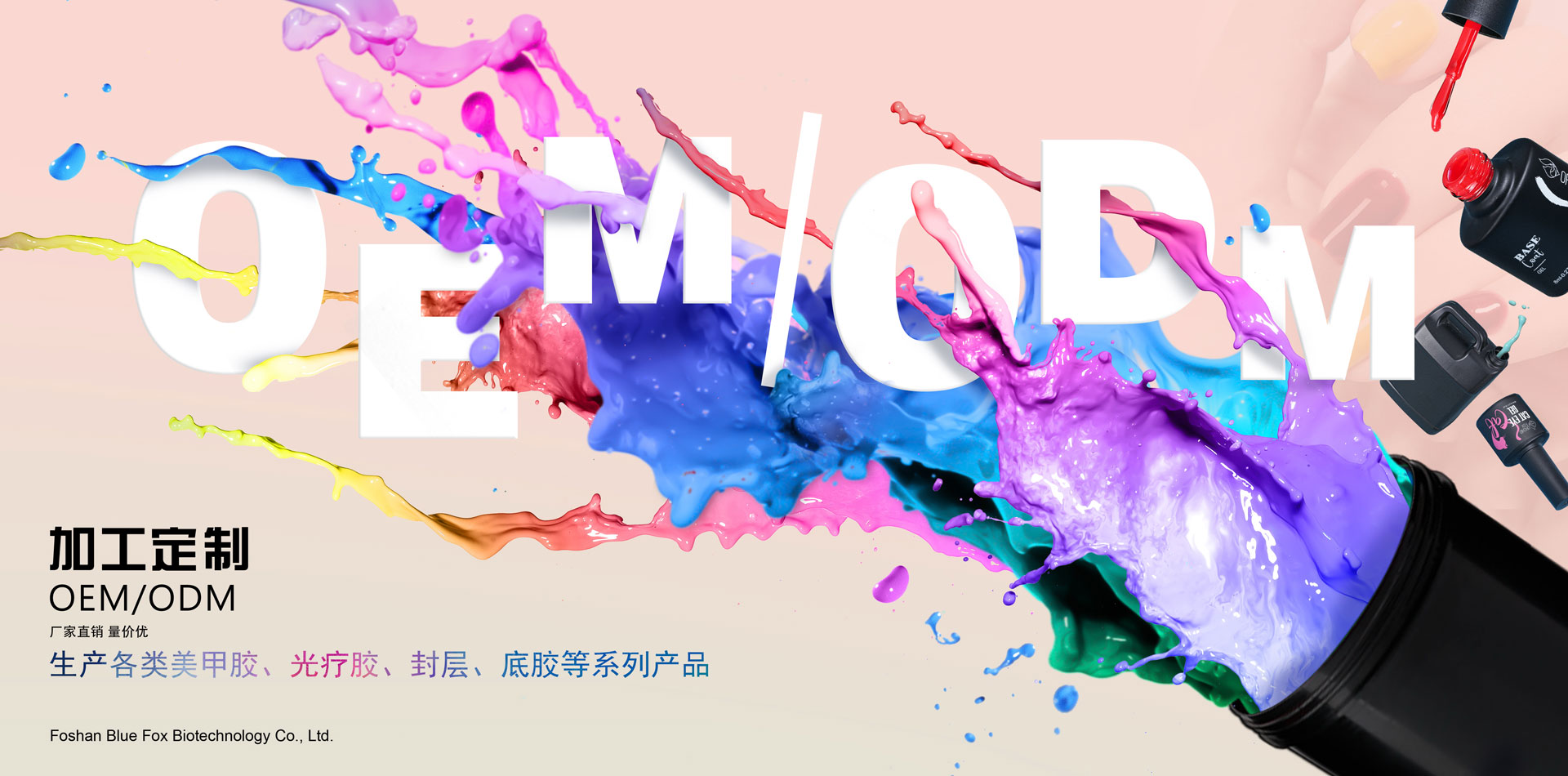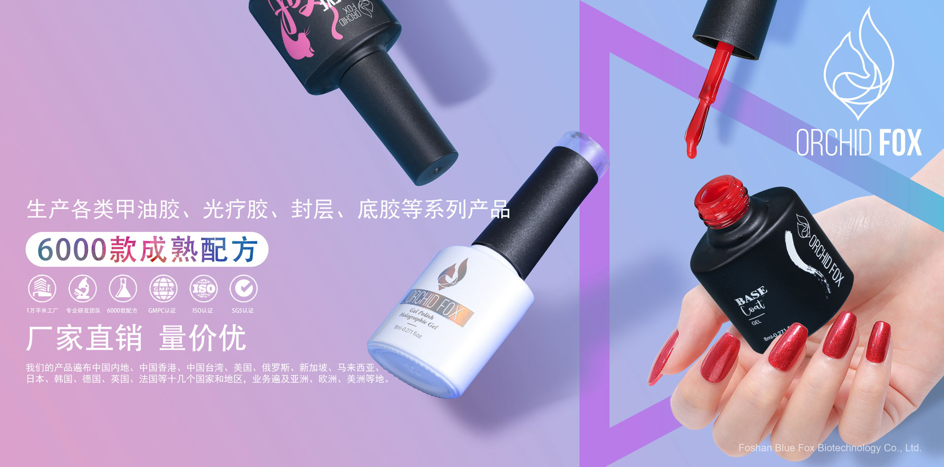 佛山市藍狐生物科技有限公司(原廣州甲逸妝品有限公司)位于廣東省佛山市科技工業園內,擁有自主研發的生產基地,十萬級GMP化妝品生產車間,高級實驗室和研發團隊,和商品進出口權,已獲得歐美ISO22716、GMPC質量體系及SGS認證. 公司致力于美甲產品的研發和生產,主要生產美甲膠、指甲油、Polygel、水晶粉、光療延長膠、底膠、封層、各種功能膠及大包裝基料。現公司旗下創立“甲逸 ” “十指繡””SZXvenus””ORCHID FOX”美甲品牌,提供各類美甲OEM/ODM代加工基料及產品備案服務,公司擁有雄厚的科研力量和高效的生產能力,同時在不斷提高產品質量并開發新產品,形成了廣泛的銷售網絡,已得到國內外客戶高度認可。 我們始終追求“以人為本,誠實守信”的經營理念,并貫徹于研發、生產、銷售和售后服務的各個環節。公司堅持開發環保優質的美甲產品,倡導美甲行業健康發展!